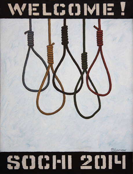 (Vasiliy Slonov) Russian gallery curator, Marat Guelman, was recently fired after refusing to censor the controversial artwork of Vasiliy Slonov in an exhibition entitled “Welcome! Sochi 2014” at the Perm Museum of Contemporary Art.
