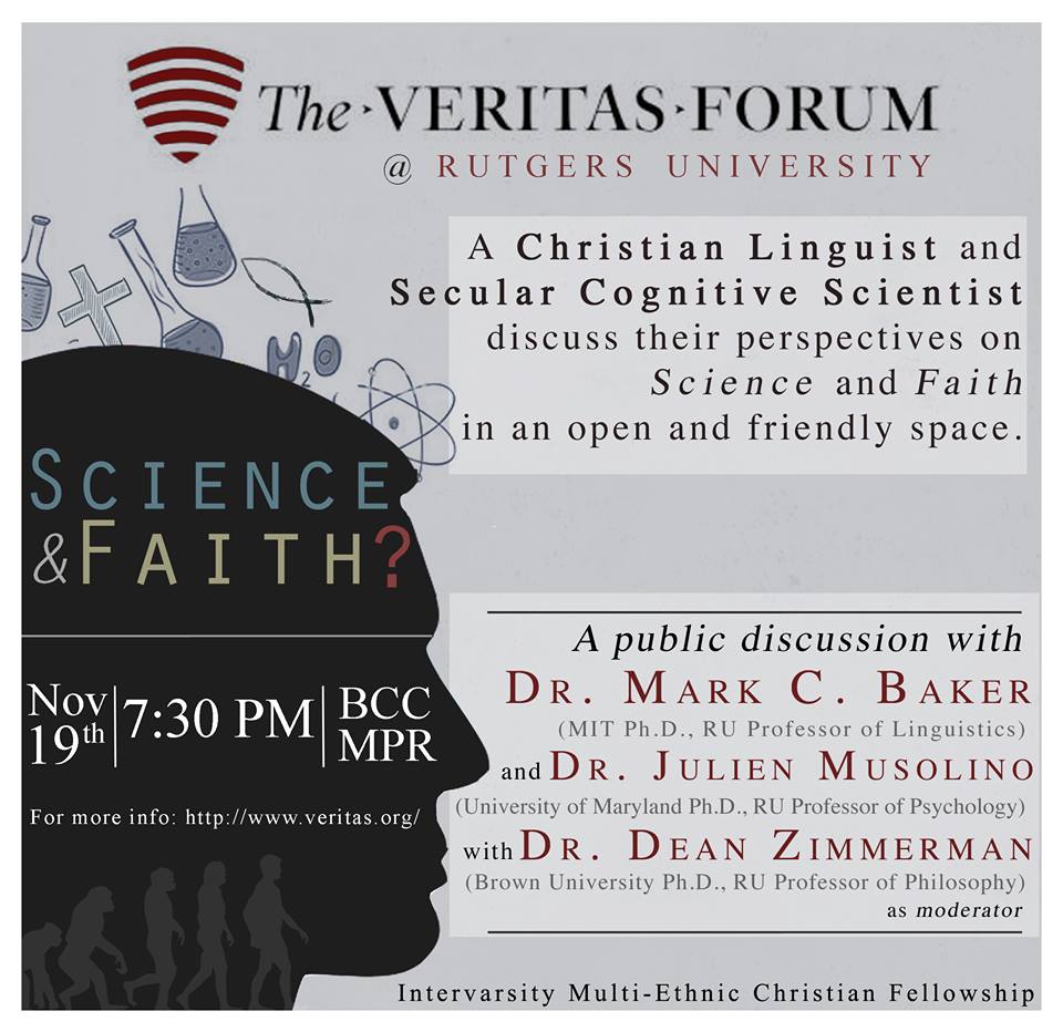 This is just one of the many things I learned from attending the The Veritas Forum last night, sponsored by the InterVarsity Multi-Ethnic Christian Fellowship (IMECF). The debaters were Professor Julien Musolino (who you all remember from his two A.S posts and the interview I did with him) and Professor Mark Baker, a linguist here at Rutgers. Despite the IMECF’s repeated assurance of respectfulness and understanding, I could definitely sense some tensions among the 300-something attendees of the event. In fact, when the debaters first took the stage I could almost hear Professor Dean Zimmerman (the moderator) boom into the mic: “…and in this corner, representing the secularist side, it’s the one, the only, the soul-crusher himself, Professor Julien Mussolino!”