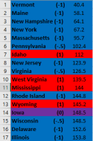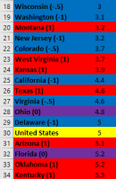 This is the first indicator where the losing political party has a major win, namely a lot more Democrats that are Failed States. However, given that they have a 100% lead among Model States, the other side of that coin, and win all other categories, including 3 major wins, Democrats are still clearly the winner here. For instance, a Blue state is almost 3 times more likely to be above the US average compared to a Red state!