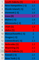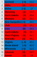 What seems to be the case is that there’s decently solid trend that Dem’s do better, but that there are atypical outliers on both ends, i.e. a few Republican states that do particularly well and a few Dem’s do particular poorly. However, the greatest outliers, first and last place, fit the overall trend.