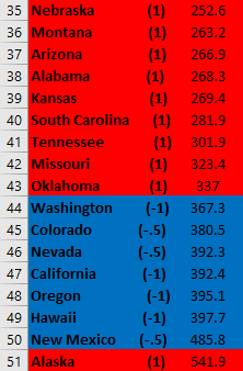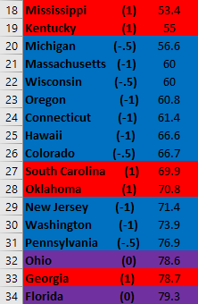What seems to be the case is that there’s decently solid trend that Dem’s do better, but that there are atypical outliers on both ends, i.e. a few Republican states that do particularly well and a few Dem’s do particular poorly. However, the greatest outliers, first and last place, fit the overall trend.