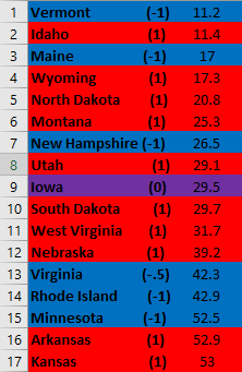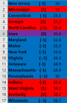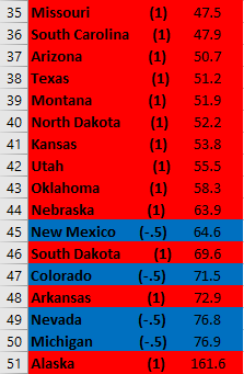 Adding to this solid win, you might notice that 4 out of 6 of the Blue states under the US average have a (.5) next to them. That means they only voted for Democrats in 3 of the last 4 elections, not like (1) states that voted 4 out of 4. Keep an eye out for this, since it isn’t formally accounted for in this study.