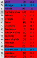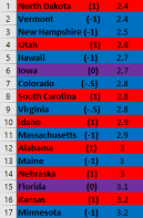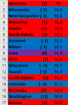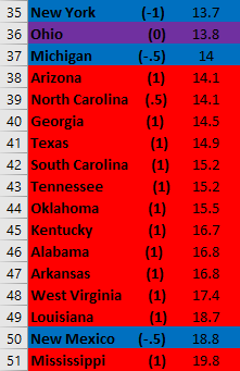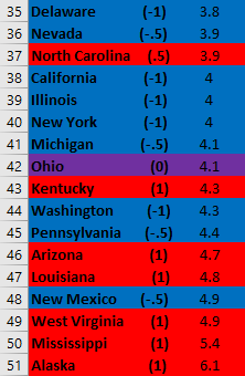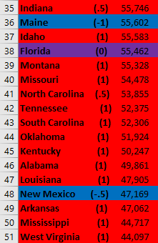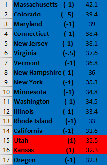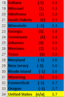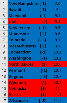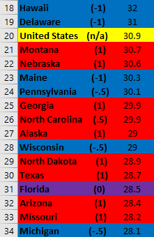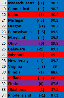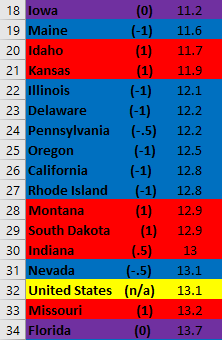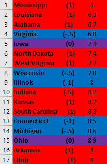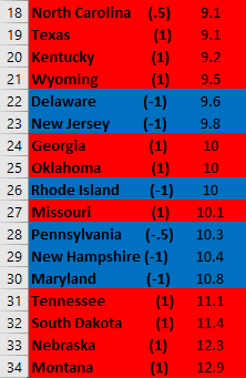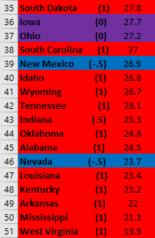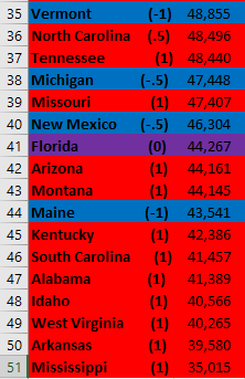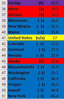 Second, it looks like this metric would benefit a lot from elucidating partisanship a bit more. For instance, the first “solid Blue state” with a (1) is 8th from the bottom. Additionally, a very close majority of Red and Blue states are above the US average.