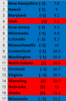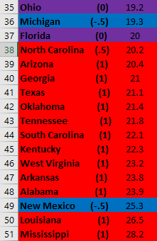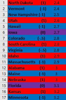 First, some points about analysis. Namely, there isn’t much difference or variation in the numbers as I’d like, resulting in a lot of ties. So, for instance, I had to take the top 6 and bottom 16 states. This, combined with the fact that Purple states count as zero (see the Methodology post), made for some weird results for both “Basket” metrics.