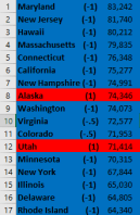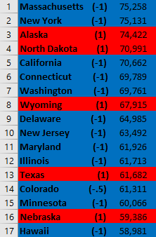 First, I’d like to point out that, again, it looks like oil is responsible for the Red state outliers who’re above the US average. Alaska and North Dakota were already noted, but Utah fits the mold since it earned 10th place in oil production in the source I link to above.