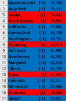 If you have any questions about purchasing power parity, what year $$’s are bench-marked at, real vs nominal figures, etc etc, then please check out the respective data sets linked to in this Excel document on Economic Indicators. Since this is just a personal side project I’m doing for fun, I decided to defer to whatever that gov agency decided was the best to collect and present that stat when comparing states.