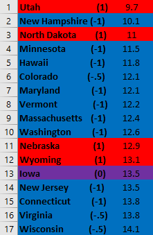 Using US Census data, below are how states ranked.