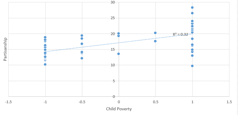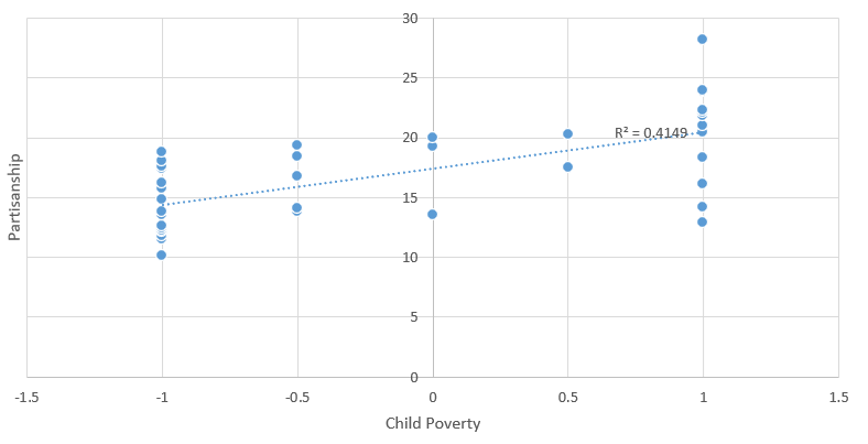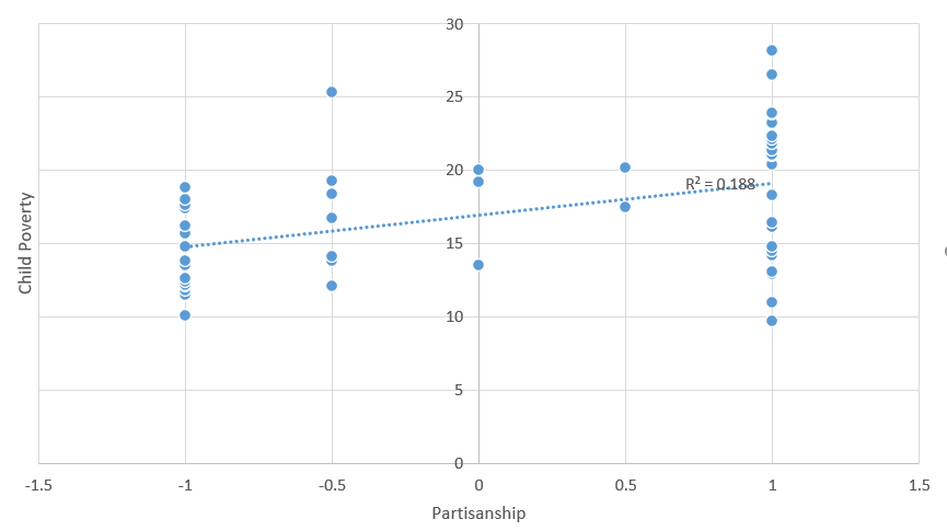 Just eye balling this data, most people I’ve spoken to can see a noticeable disparity – Republican voting states seem to have a lot more poor children than Democrat states. (Note: everything in this study is per capita or percent of population.) However, 1) there are a few notable outliers (more on that later!). 2) this data doesn’t show the magnitude of difference between states, just ranked order. And 3) with anything social, there are tons of different determinants or causal factors that also play a role and aren’t (yet) factored in. So, more statistical analysis is necessary to see if there is a statistically significant relationship between state partisanship and child poverty.