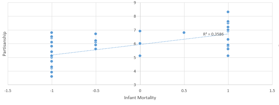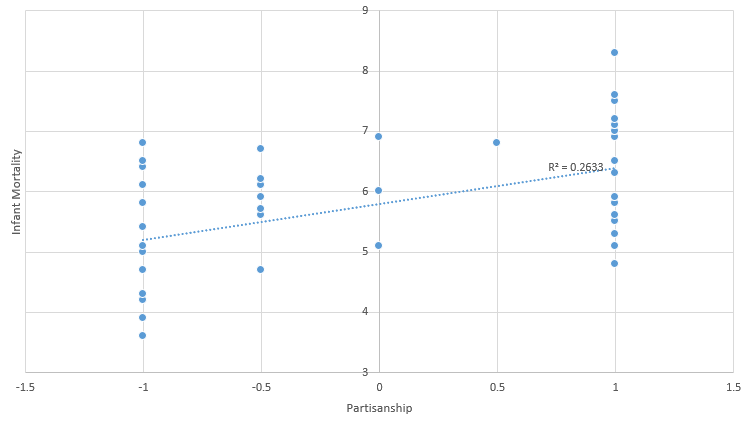 An R^2 value of .2633 is much better! Right off the bat, without factoring in any other determinants, we have a nearly statistically significant result. Partisanship explains over a quarter of the variance we see in Infant Mortality between states.