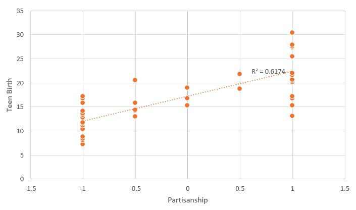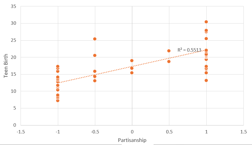 The same as with Child Poverty and Infant Mortality, it seems that oil producing states are outliers who are doing better because of oil independent of their socio-political values. When we look at non-oil producing states, partisanship explains a whopping 67.6% of the variance. It therefore seems credible to believe that Democrats’ package deal is much better than Republicans. Or at least, it’s willful ignorance to try to argue that we should listen to Republicans’ if we want to avoid the agreed upon horrible outcome of children raising children.